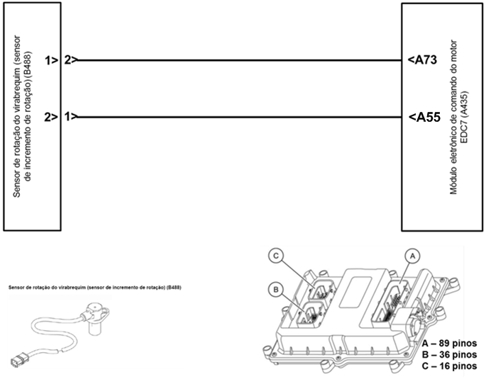 O módulo EDC7 monitora o sinal do sensor de rotação do virabrequim.