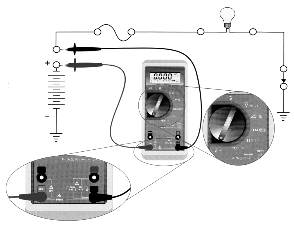 Selecione a função de tensão CA (V~) ou CC (V-) no medidor. Encoste a ponta de prova positiva (+) do multímetro em um terminal e a ponta