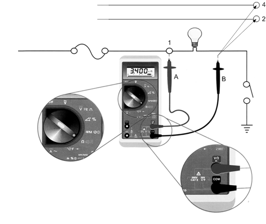 componente a ser medido. Conforme desenho abaixo, encostar a ponta de prova (A) no ponto (1) do circuito, e a ponta de prova (B) deverá