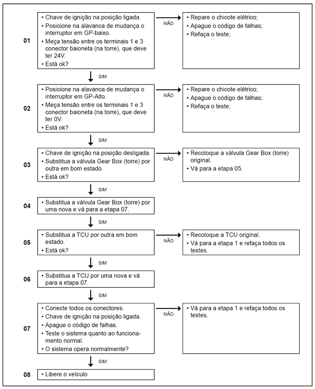 O módulo TCU (Transmission Control Unit) monitora a conexão elétrica da válvula do GP.