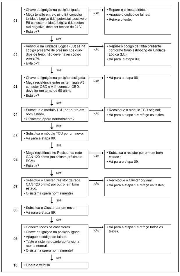 O módulo TCU (Transmission Control Unit) monitora o recebimento da mensagem dos níveis de pressão dos cilindros de freio.