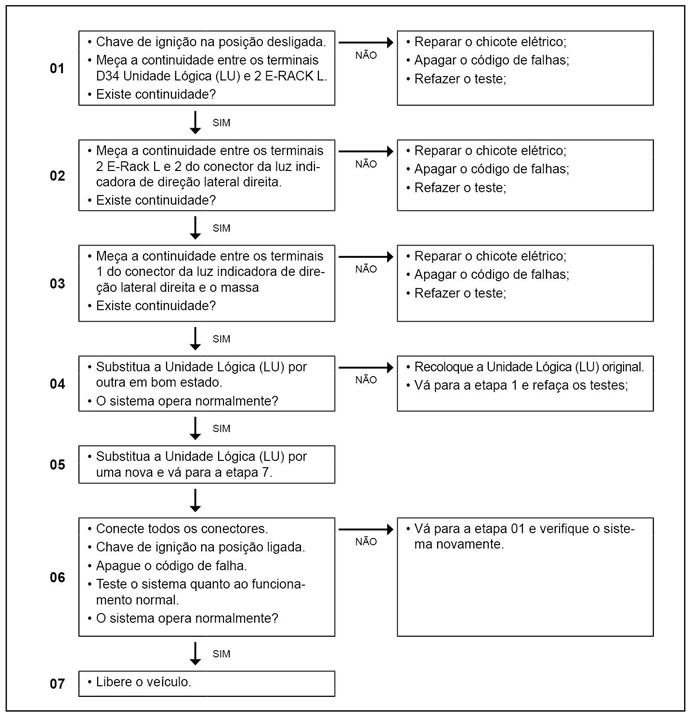 Analisar o filamento da lâmpada e medir a continuidade entre os dois pólos da luz indicadora de direção lateral direita.