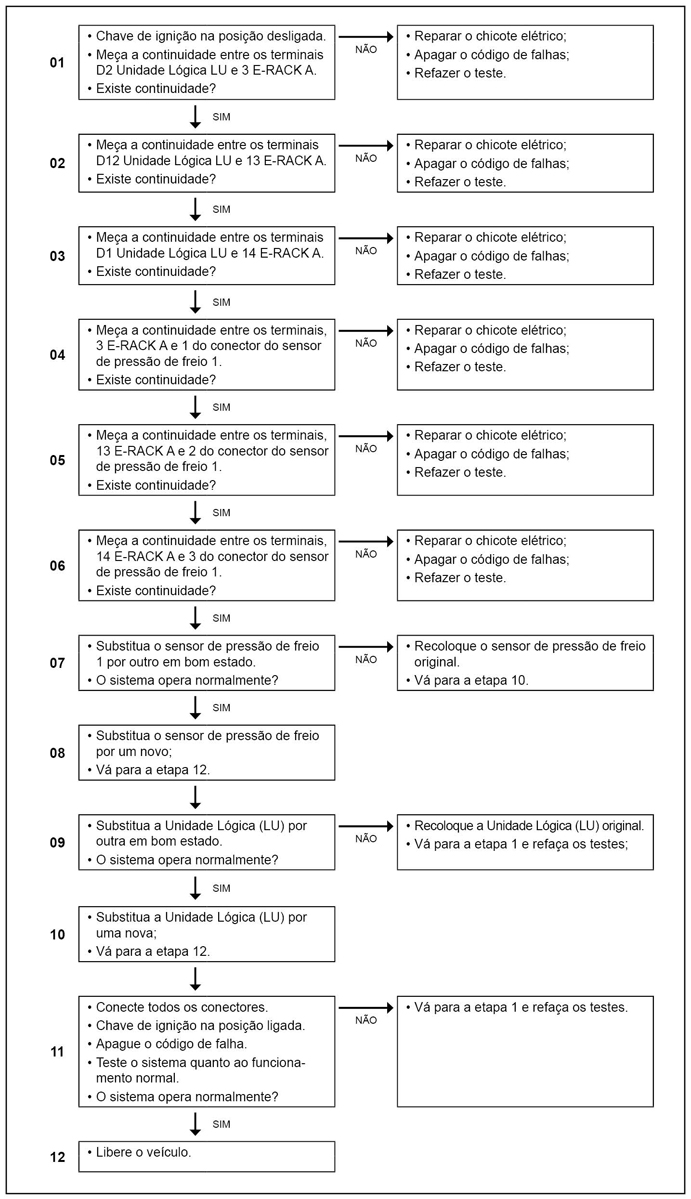A luz de advertência de pressão do freio permanece ligada enquanto a falha estiver ativa e o display no computador de bordo, indicará PRES 1.