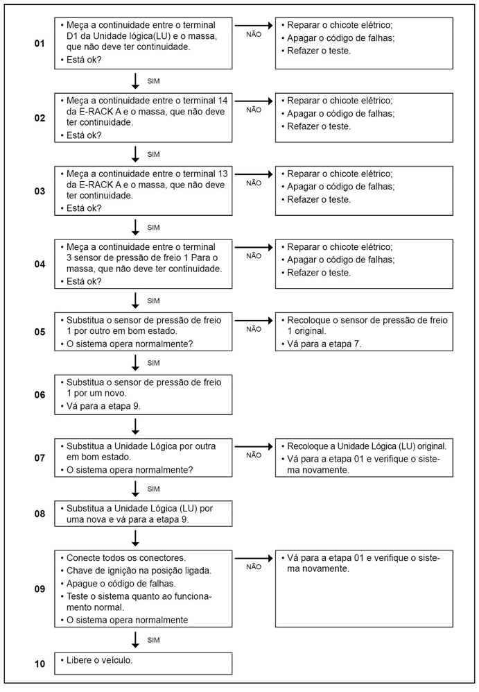 A luz de advertência de pressão do freio permanece ligada enquanto a falha estiver ativa e o display no computador de bordo, indicará PRES 1.
