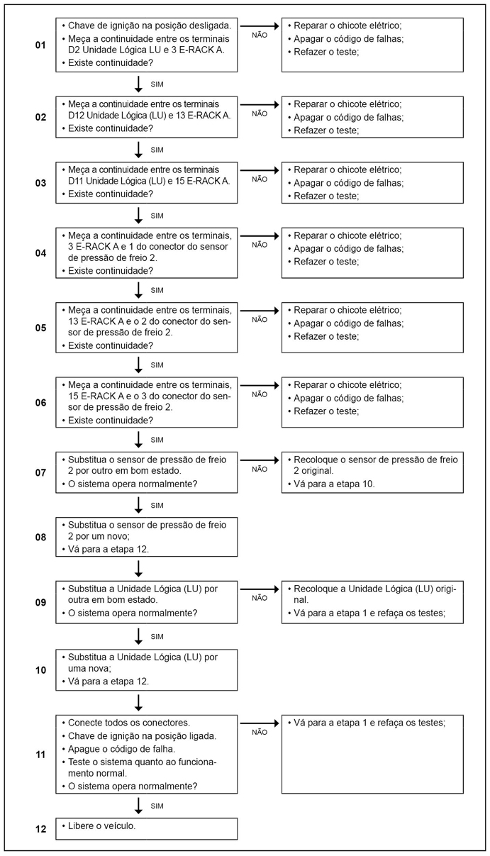 A luz de advertência de pressão do freio permanece ligada enquanto a falha estiver ativa e o display no computador de bordo, indicará PRES 2.