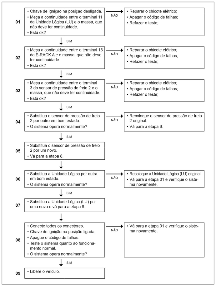 A luz de advertência de pressão do freio permanece ligada enquanto a falha estiver ativa e o display no computador de bordo, indicará PRES 2.