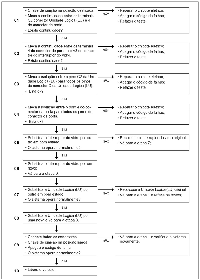 – Verificar interruptor de controle levantamento vidro porta do passageiro com defeito conforme tabela abaixo.
