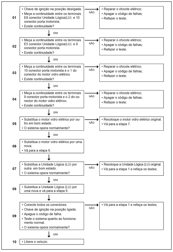 Erro na ponte elétrica de acionamento do vidro elétrico motorista circuito em aberto. |
