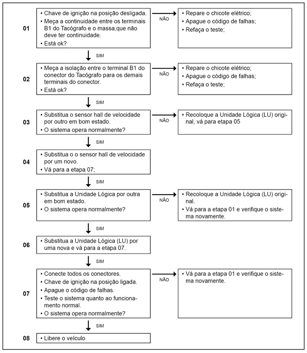 A Unidade Lógica (LU) monitora se há curto circuito na alimentação do sensor de velocidade (sensor Hall).