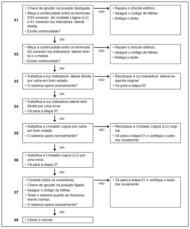 A Unidade Lógica (LU) monitora o circuito da luz indicadora de direção frontal direita quanto à curto para o massa e interrupção.